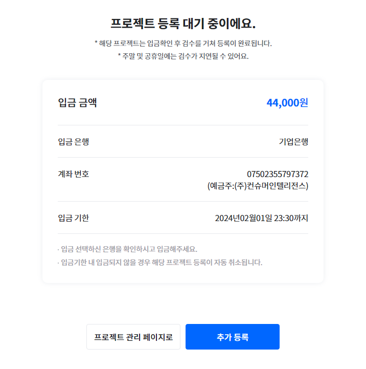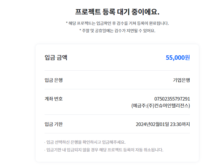 계좌 무통장입금하고 나니 이제 바로 모집이 되더라구요.