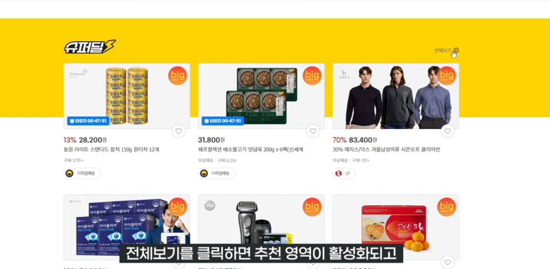 메인 페이지에서 조금만 내리면 슈퍼딜이 따로 활성화되어있기 때문에, 노출에 훨씬 유리하다고 한다.
